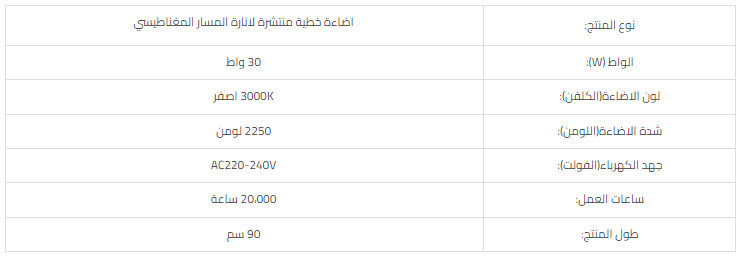 نوع المنتج: اضاءة خطية منتشرة لانارة المسار المغناطيسي الواط (W): 30 واط لون الاضاءة(الكلفن): 3000K اصفر شدة الاضاءة(اللومن): 2250 لومن جهد الكهرباء(الفولت): AC220-240V