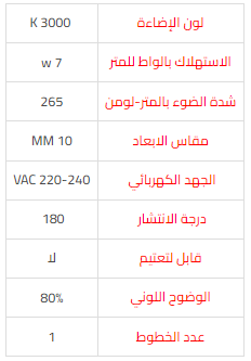 لون الإضاءة 3000 K الاستهلاك بالواط للمتر7 w شدة الضوء بالمتر-لومن265 مقاس الابعاد10 MM الجهد الكهربائي 220-240 VAC